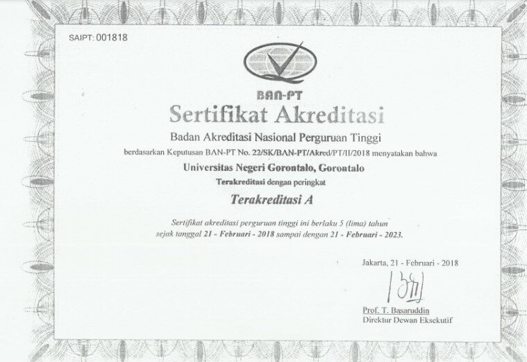 Sesuai dengan Surat Keputusan Badan Akreditasi Nasional Perguruan Tinggi nomor 22 Tahun 2018 bahwa Universitas Negeri Gorontalo (UNG) resmi terakreditasi dengan peringkat terakreditasi A.