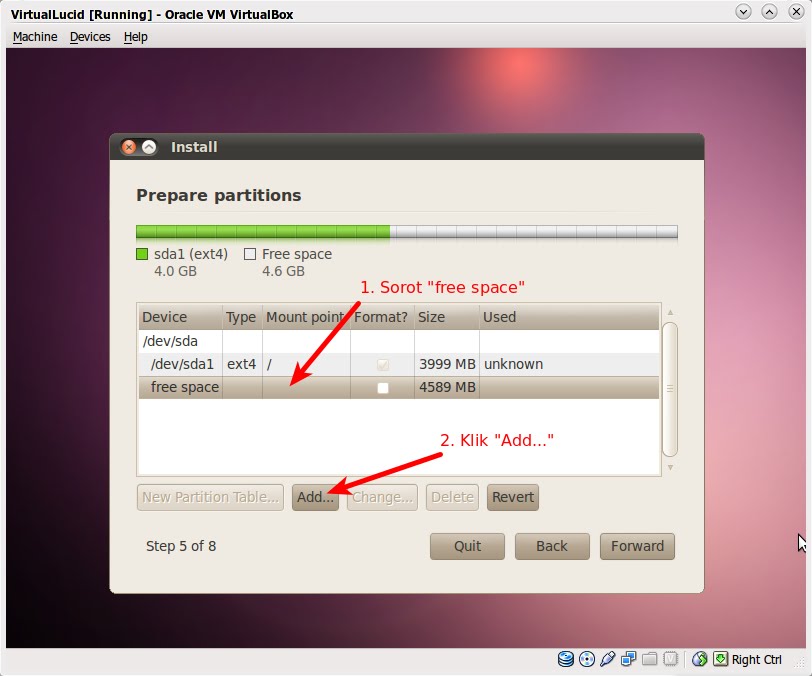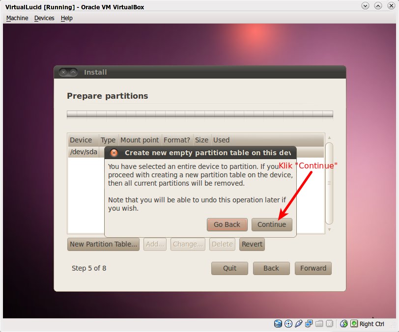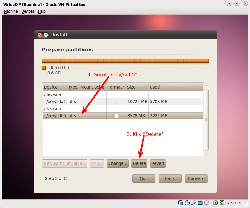 Perhatikan baik-baik gambar di atas (klik untuk memperbesar). Di sana sudah terdapat dua partisi dengan "type" ntfs. Drive C: pada Windows dipetakan dengan "/dev/sda1", sedangkan drive D: dipetakan dengan "/dev/sdb5", bagaimana cara mengetahui hal ini. Cara mudahnya adalah dengan mencatat kapasitas total dan kapasitas yang sudah digunakan pada masing-masing drive ketika masuk ke sistem operasi Windows. Saat berada di Windows saya mencatat drive C: berukuran total 10 GB dan sudah digunakan sekitar 5 GB, sedangkan drive D: berukuran total 8 GB dan sudah digunakan sekitar 3 GB. Nah, sekarang teman-teman sudah tahu cara membedakan mana drive C: dan D: bukan? Yang akan digunakan untuk partisi Ubuntu pada contoh ini adalah drive D: atau "/dev/sdb5". Perlu diketahui, semua data di D: akan hilang pada proses partisi ini, jadi lakukan back-up sebelum memulai menginstal Ubuntu.