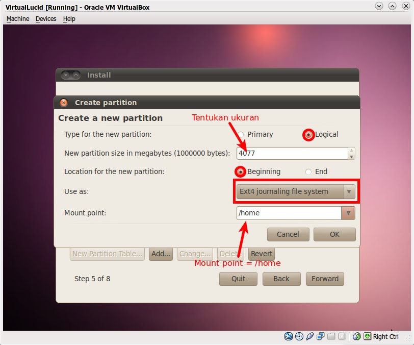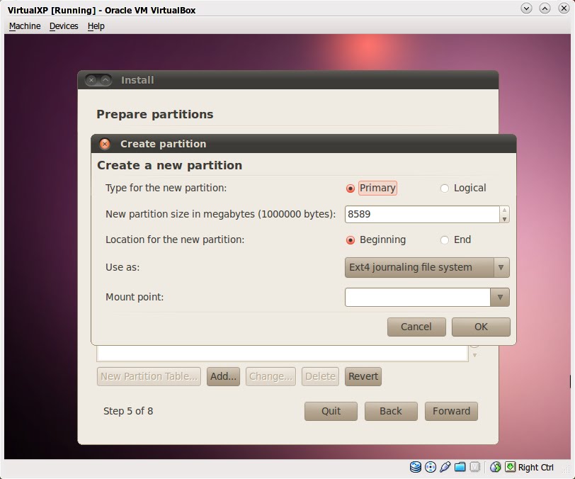 Pada "Type for new partition" pilih "Primary". Tentukan ukuran yang kalian inginkan pada "New partition size bla bla bla". Saya memilih 4000 MB (hampir 4 GB) karena saya mempunyai total space hard-disk 8 GB, sesuaikan dengan keadaan dan keinginan teman-teman. Pada "Location for the new partition" pilih "Beginning". Gunakan pilihan "Ext4" untuk opsi "Use as". Sedangkan untuk "Mount point" pilih atau isi dengan "/". Tanda "/" adalah tanda root dari partisi, partisi root merupakan partisi tertinggi di Linux atau mudahnya partisi root hampir sama dengan "drive C:" di Windows. Klik "OK" jika sudah yakin.